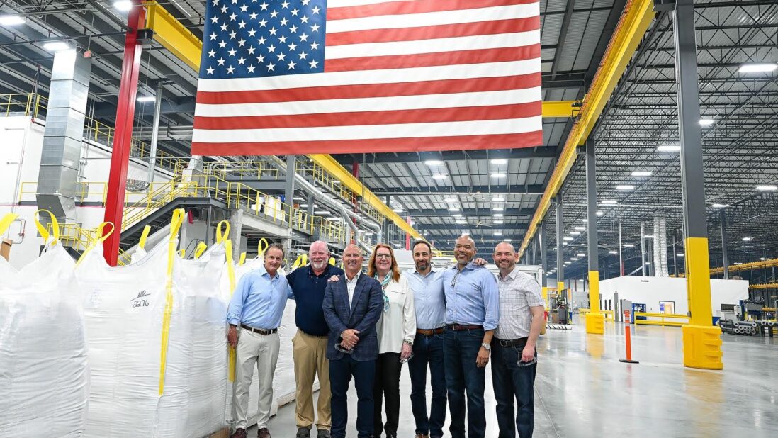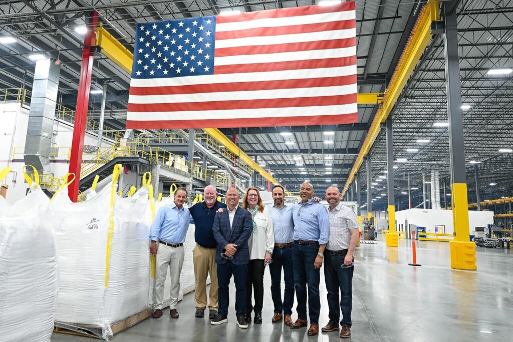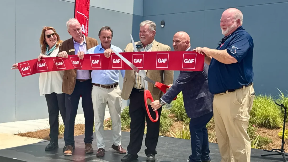 Valdosta is the fifth thermoplastic polyolefin (TPO) plant in GAF’s network and produces EverGuard TPO roofing products, used in low-slope commercial roofs. From left to right: John Altmeyer, Daniel Duston, John Barkhouse, Alma Garnett, Abdallah Simaika, Chris Rector, Dan Karins.
